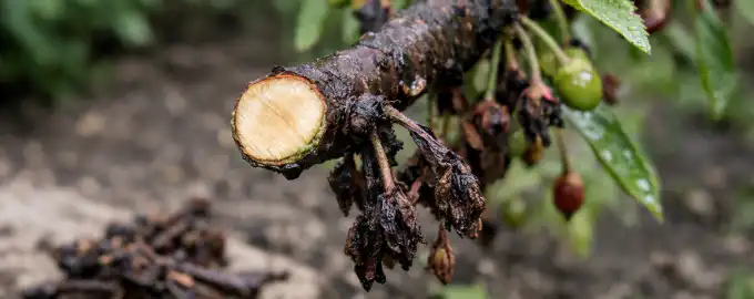 Si tus cerezos se convierten cada año en árboles «quemados» con ramas secas, el culpable es el siguiente plaga de la moniliasis. Esta enfermedad fúngica