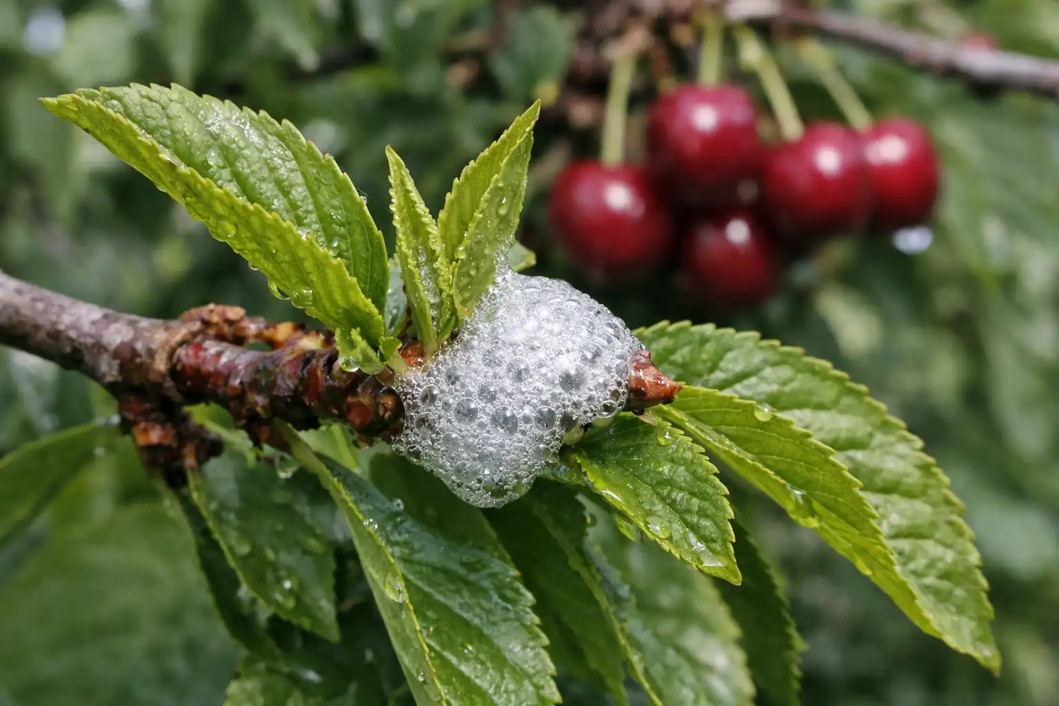 Parece que los pulgones no tienen idea de lo que les espera. ¡Un baño de jabón y adiós a la fiesta de las cerezas!