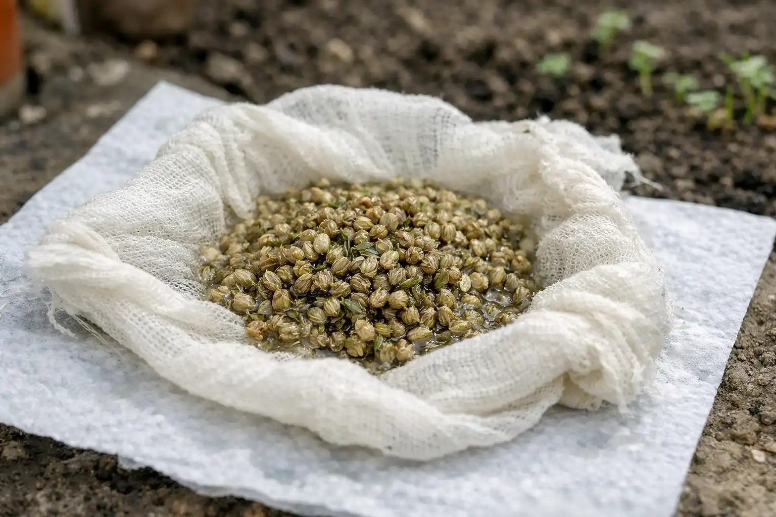 Para romper la capa aceitosa, utilizo un vodka o agua caliente (unos 50 grados centígrados). Las semillas deben introducirse en una bolsa de gasa y sumergirse en el líquido durante 15 minutos. Después, hay que aclararlas con agua corriente fría. Esto estimulará la energía germinativay los brotes romperán el suelo de forma mucho más agresiva.