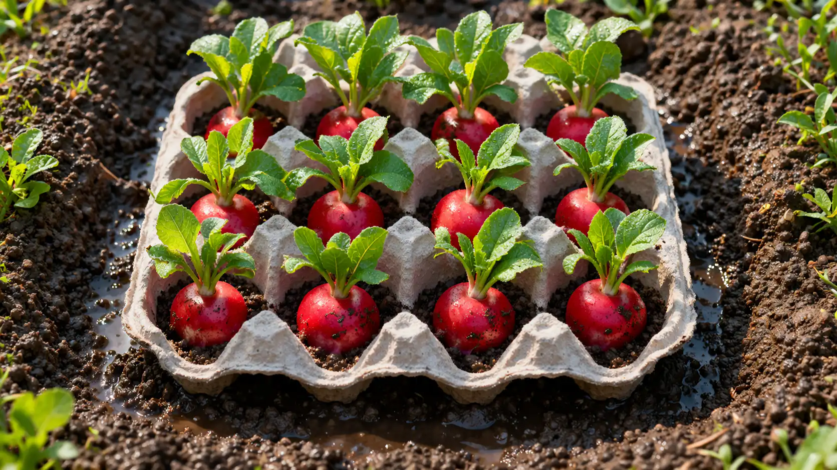 El secreto principal es el uso de bandejas de cartón de huevos. Sirven tanto de plantilla como de capa de mantilloque retiene la humedad en las raíces e impide que penetren las malas hierbas.