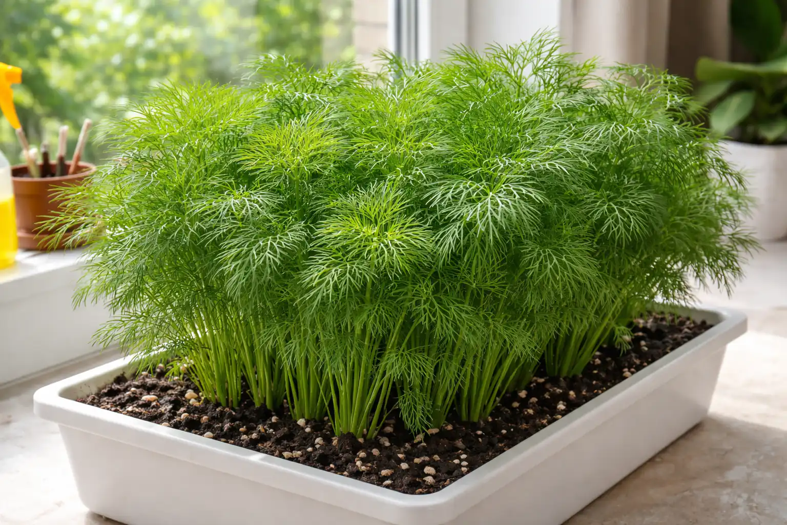 El principal secreto del éxito es no sembrar el eneldo en macetas profundas. Su sistema radicular es superficial, por lo que en bandejas anchas y poco profundas la humedad se distribuye uniformemente, lo que excluye la aparición de moho en la base del tallo.