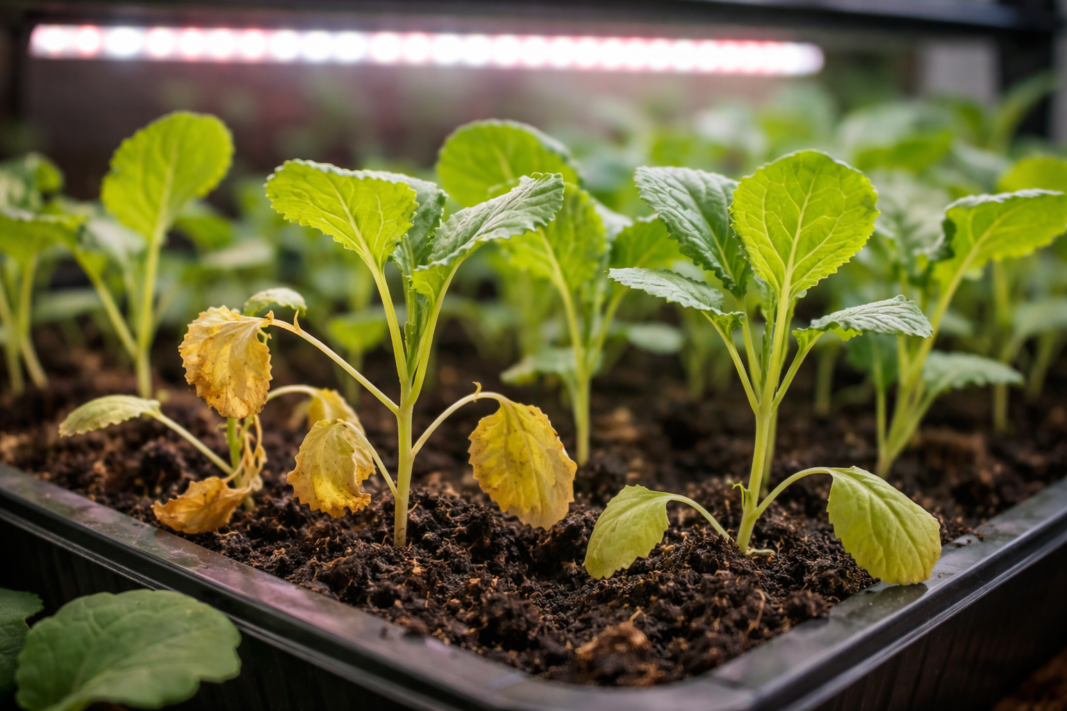 Muchos jardineros se enfrentan al hecho de que los fuertes brotes de col de repente comienzan a perder turgencia y se secan, aunque el riego se lleva a cabo a tiempo. La razón principal radica en la violación de fotosíntesis y la evaporación de la humedad, cuando la planta carece catastróficamente de luz de calidad. Sin luz UV, el tallo se alarga, se vuelve quebradizo y el sistema radicular deja de suministrar nutrición a las hojas.