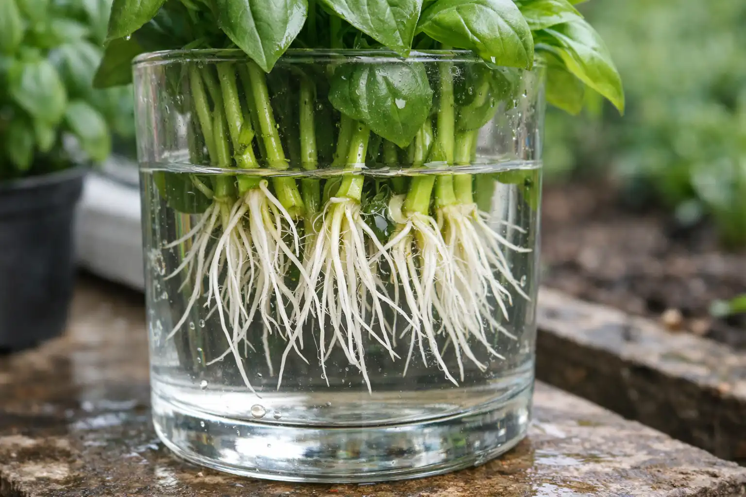 Para obtener plantas fuertes, lo mejor es un método combinado. Compra en el supermercado un manojo de albahaca fresca con tallos robustos. Corta las puntas de unos 10 cm de largo y ponlas en agua. Al cabo de 5-7 días, aparecerán raíces blancas y fuertes y la planta estará lista para plantarse en el suelo o en una maceta.