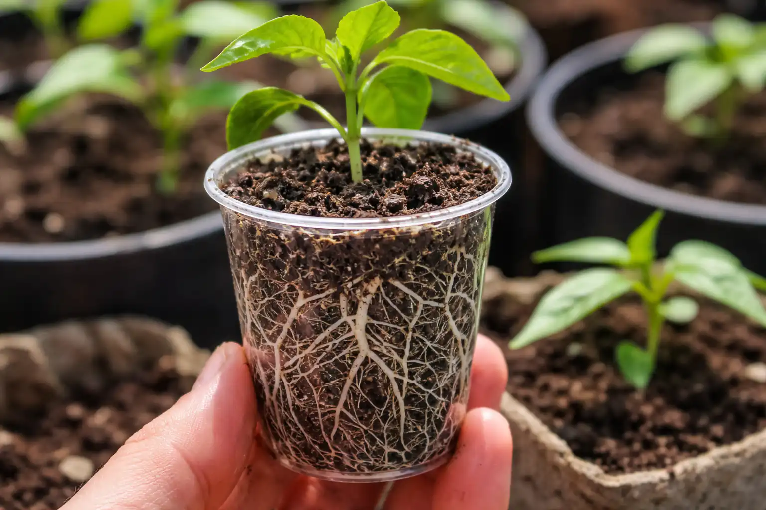 Cuando la raíz del pimiento siente los límites del contenedor, empieza a ramificarse activamente, creando una densa mata de pelos de succión. En un volumen grande, la raíz se «pierde», se convierte en un largo hilo, y la tierra sin desarrollar se estanca y priva a la planta de oxígeno.