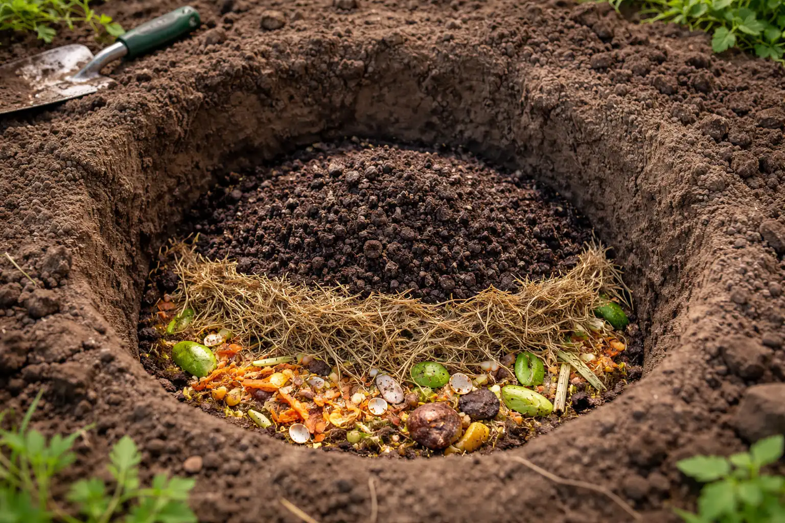 Rellena la capa inferior con materia orgánica fresca (heno, hierba, ramas finas).