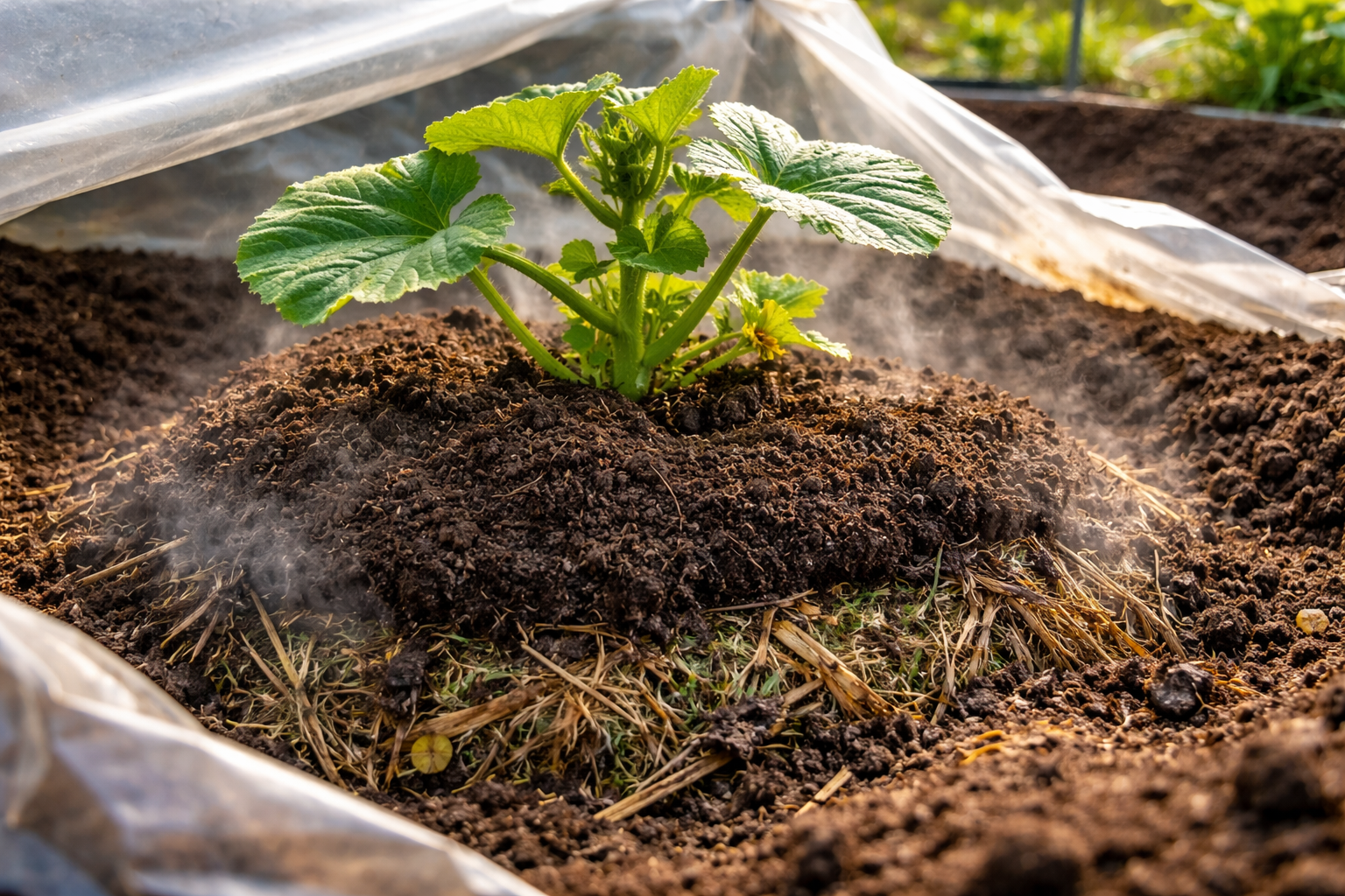 Para que las calabazas crezcan como la levadura, necesitan un «arranque en caliente». Recomiendo utilizar el método del biocombustible localizado. Una semana antes de plantar, se cava un hoyo de la profundidad de la bayoneta de una pala y se pone hierba recién cortada o heno del año pasado mezclado con compost.