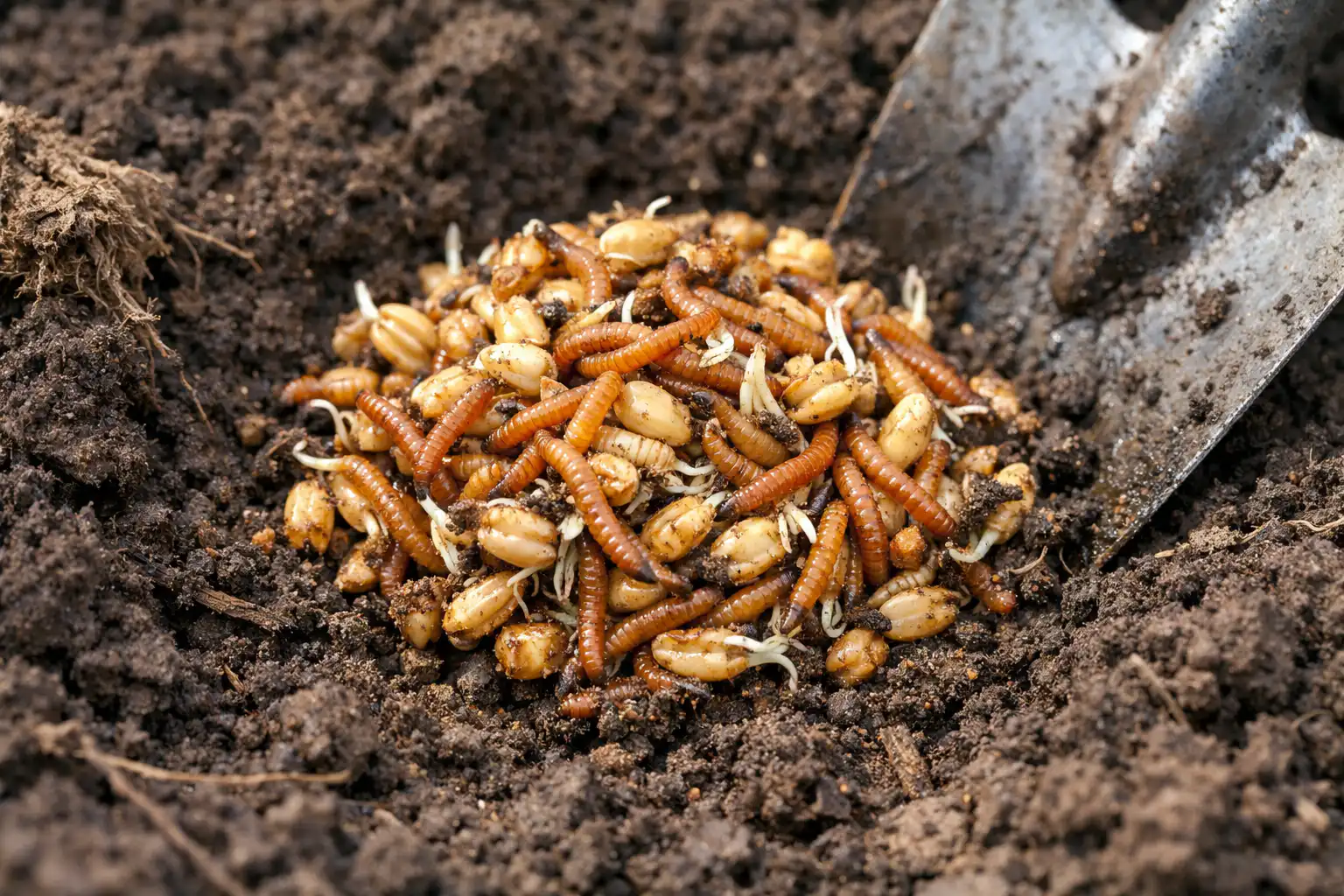 En suelo seco, el gusano de alambre profundiza, y con humedad moderada sube a las raíces, por lo que el control de la humedad ayuda a aplicar las trampas a tiempo.