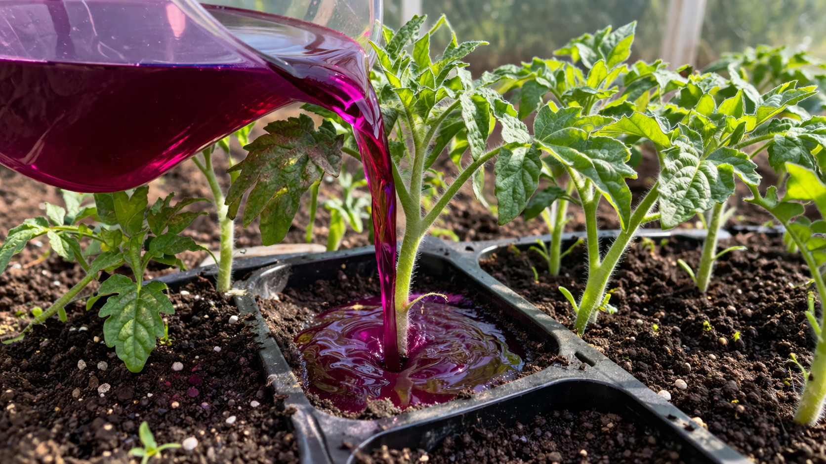 La regla principal es no verter nunca cristales directamente bajo la raíz. Permanganato potásico debe disolverse completamente en un recipiente aparte hasta obtener un color uniforme.