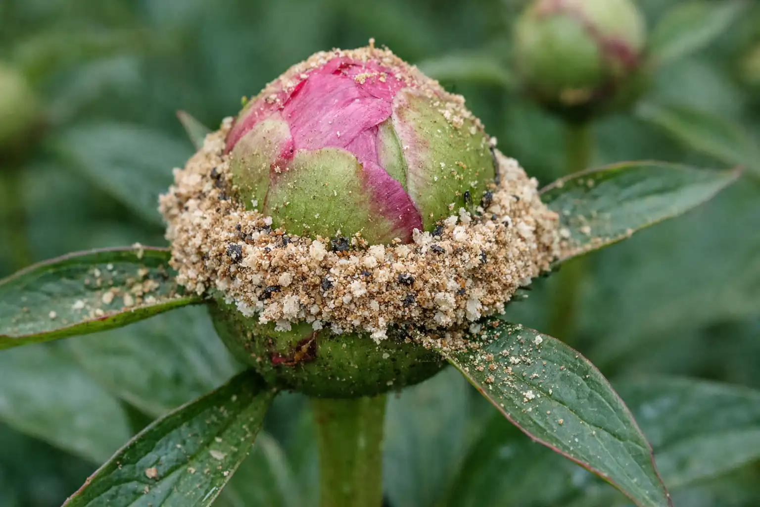 Las hormigas se sienten atraídas por jarabe de carbohidratosque segregan los sépalos de las peonías durante el periodo de brotación activa. Los propios insectos rara vez matan la planta, pero se convierten en «agricultores» para los pulgones, que se dispersan activamente hacia los brotes jóvenes.