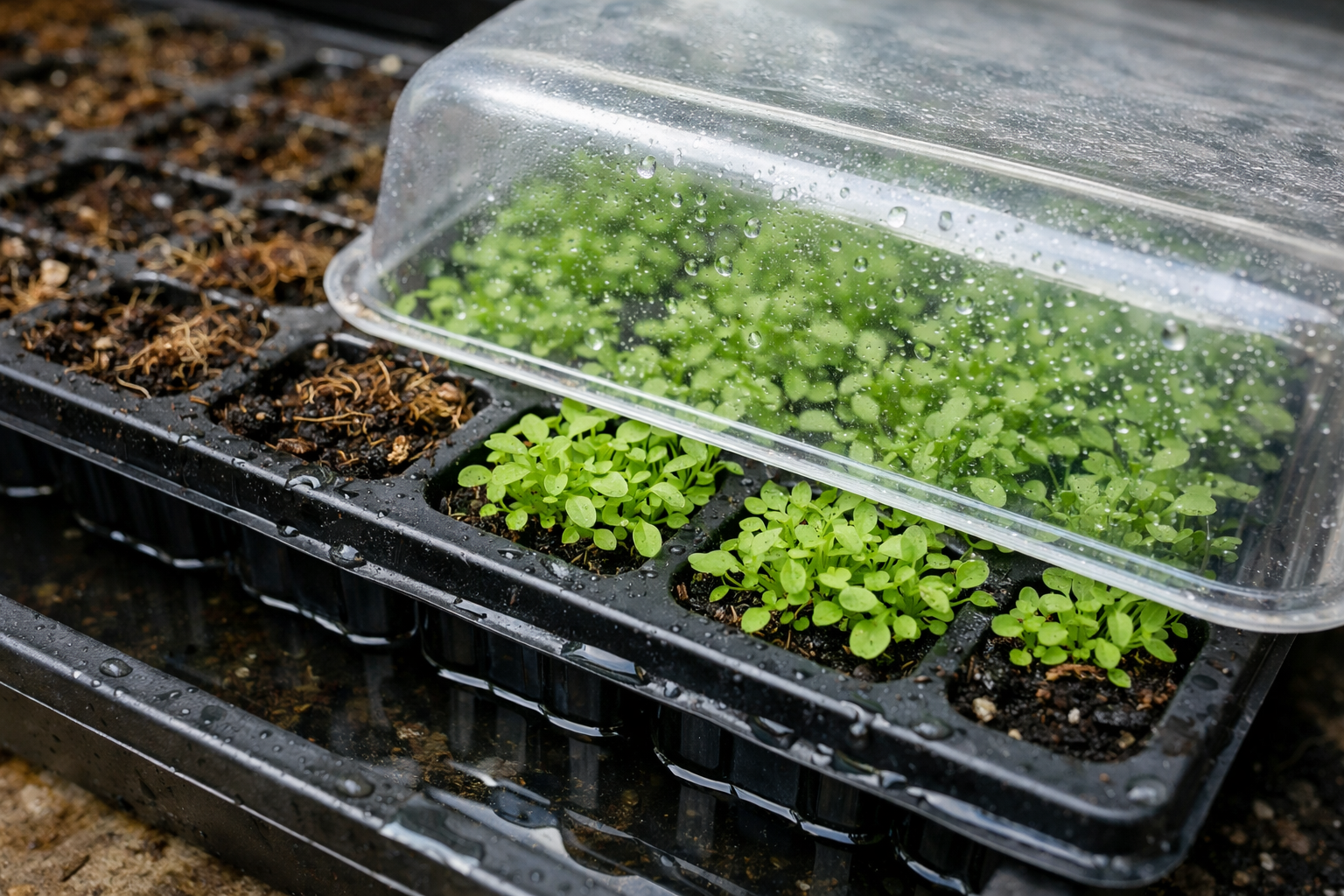 Muchos jardineros novatos cometen el error de regar los plantones desde arriba. El chorro de agua clava los delgados tallos en el suelo, lo que provoca el desarrollo de las plántulas pie negro. Recomiendo utilizar sólo riego por sumideropara permitir que las raíces extraigan la humedad desde abajo, dejando la superficie del suelo moderadamente seca.