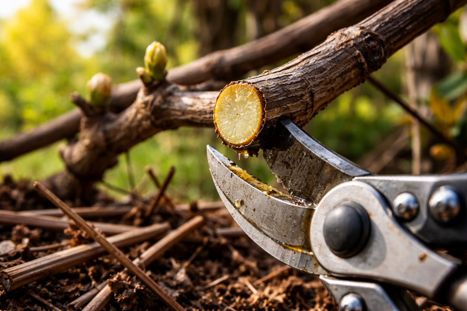 Mi matiz secreto: haz siempre un corte «ojo hacia dentro» y de forma inclinada desde la yema. De este modo, la savia (pasoka) no inundará la yema durante el «llanto» primaveral de la vid, y ésta no se secará, sino que florecerá con seguridad.