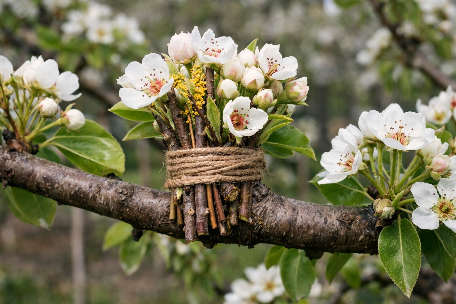 Si no quieres andar con tarros y ramas todos los años, hay una solución más duradera: el re-injerto. Basta con injertar una o dos ramas de otra variedad en la copa de su peral. Crecerán junto con el árbol principal y le proporcionarán polen cada primavera.