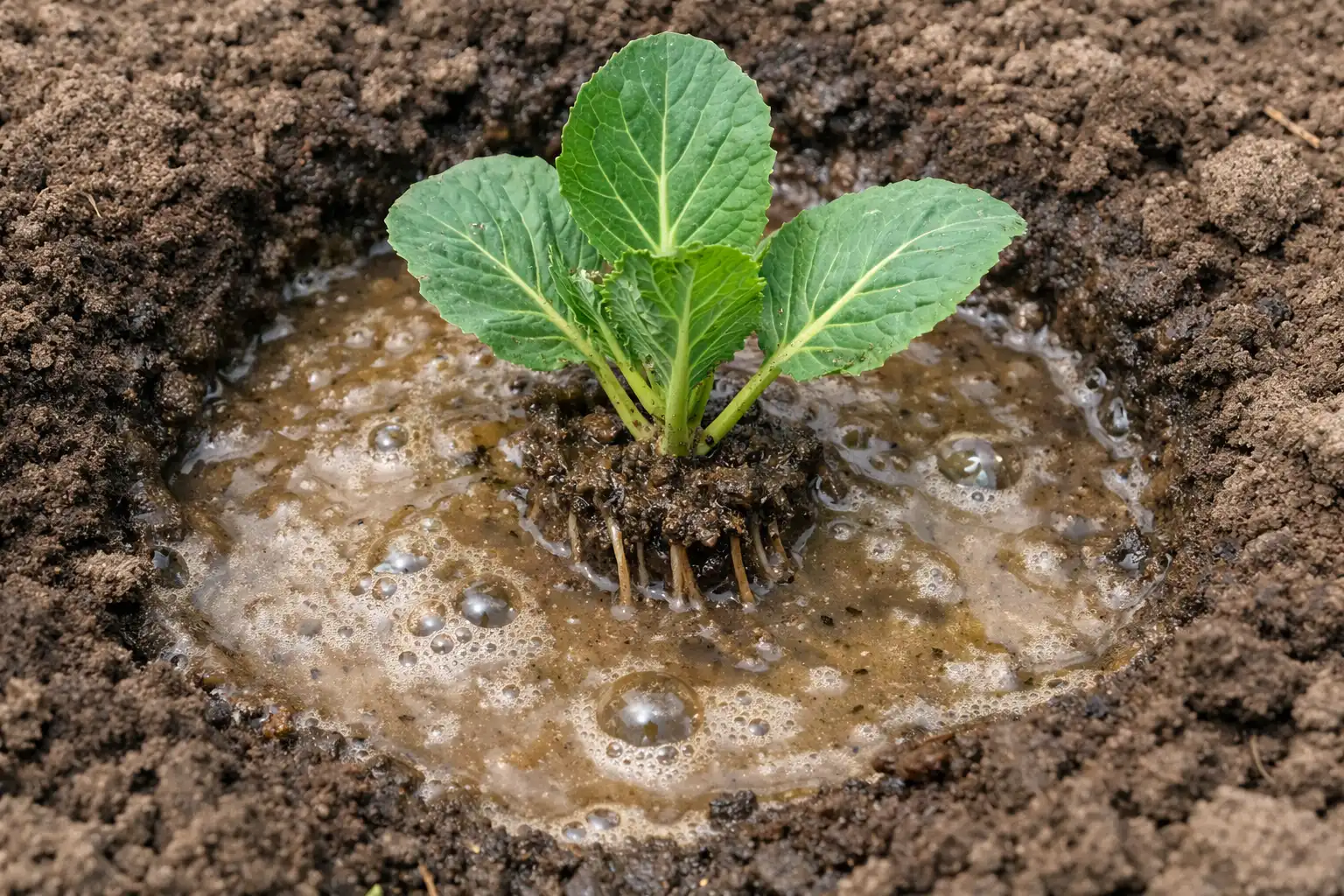Secreto: Añade un puñado de tierra leñosa normal a cada hoyo. fresnomezclada con tierra. Esto no sólo alimentará a la col, sino que también creará una barrera protectora contra la podredumbre de las raíces y el moho. cotiledonesque suelen atacar a las plantas debilitadas en momentos de estrés.