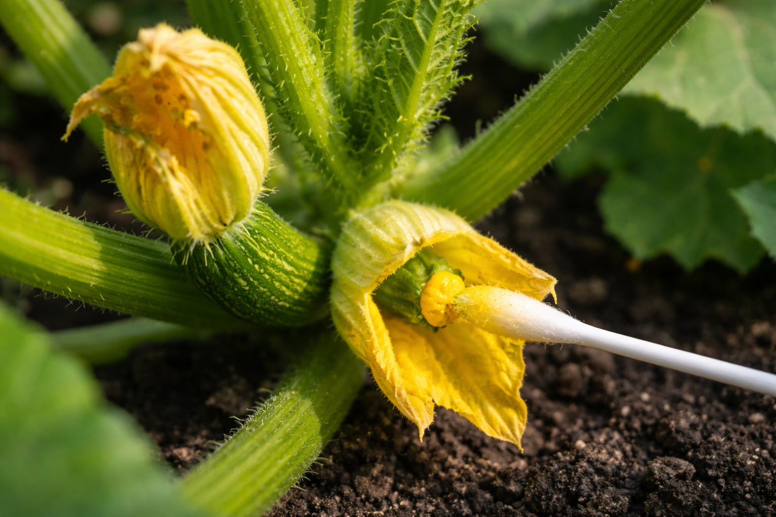 Recoge la flor masculina, retira con cuidado los pétalos y toca el centro de la flor femenina (tiene una pequeña copia de un calabacín en la base) con el estambre.
