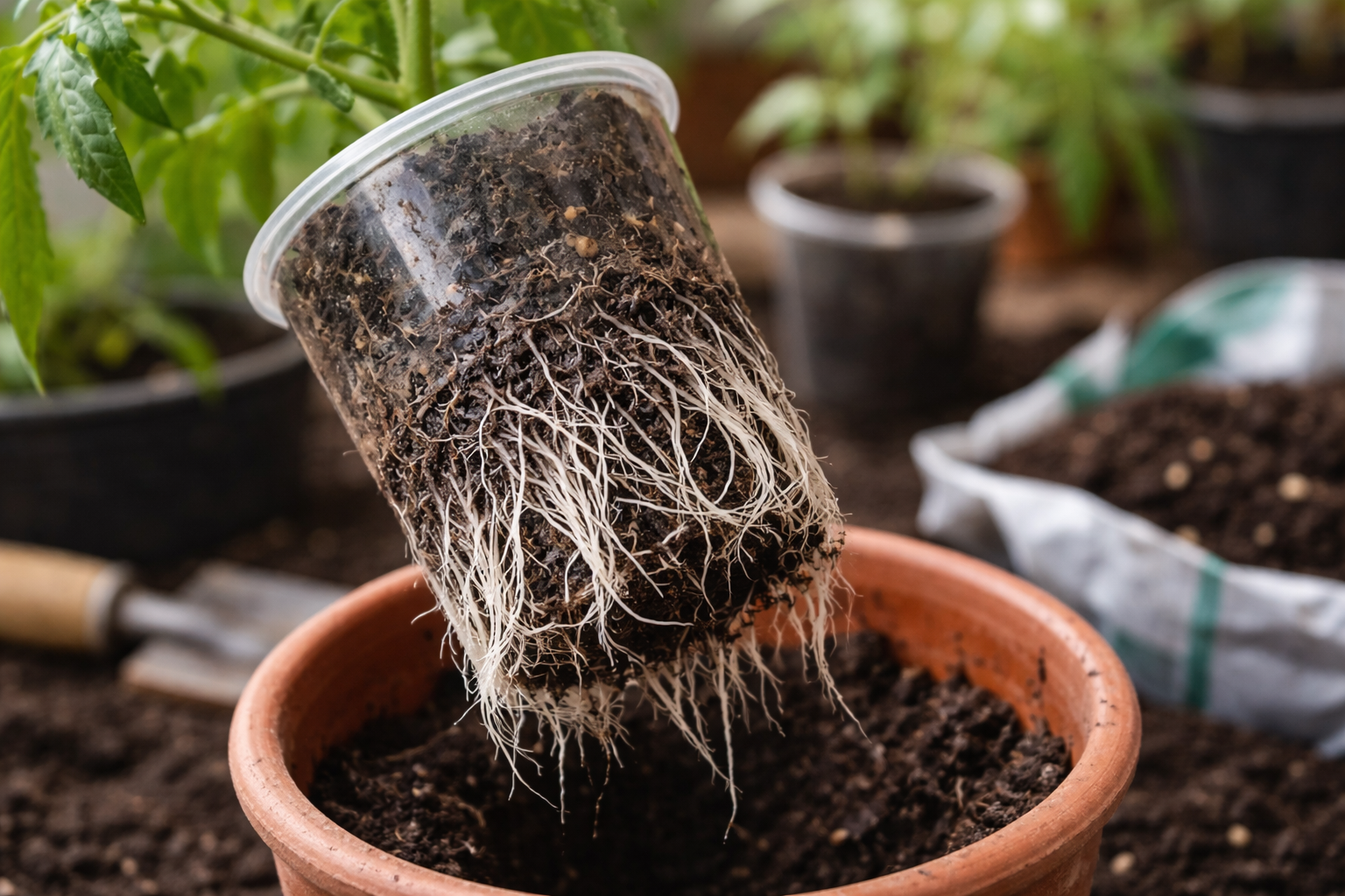 Cuando las raíces del tomate llenan todo el volumen de la maceta, empiezan a suprimirse unas a otras. La planta se da cuenta de que no hay recursos suficientes para hacer crecer toda la masa y empieza a «soltar lastre». Toma nutrientes móviles de las hojas inferiores viejas y los redirige al punto de crecimiento.