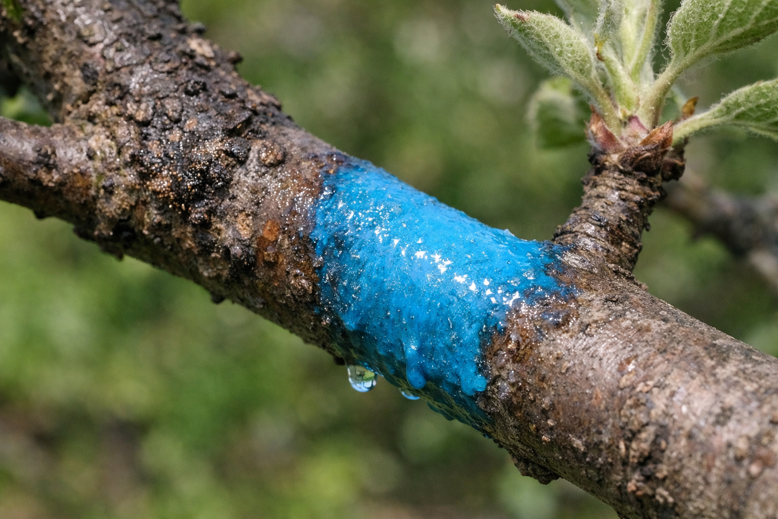 La corteza de los manzanos sanos adquiere un color azulado apenas perceptible tras el tratamiento primaveral.