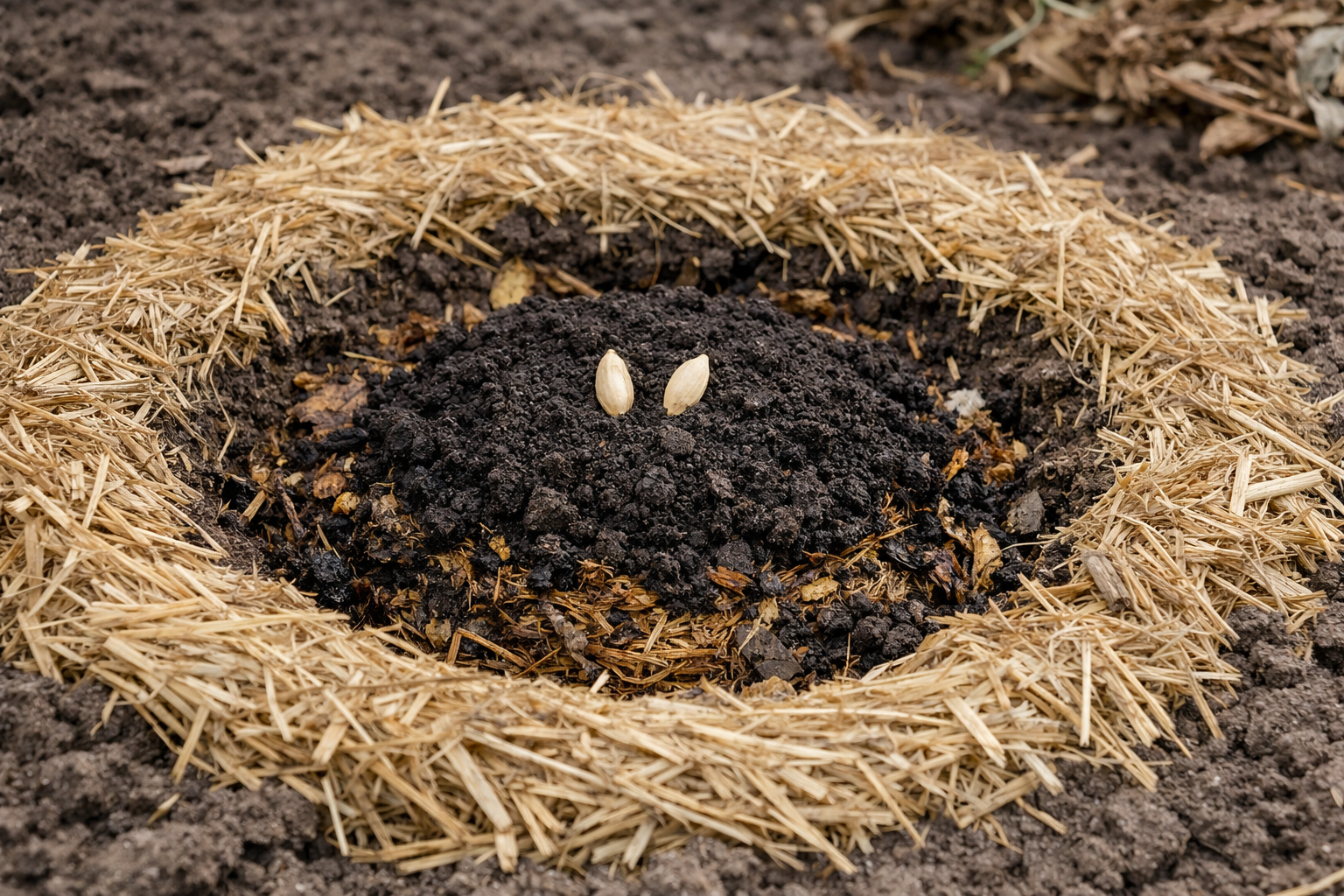Para evitar que las semillas se congelen en mayo, utilizo el método del calentamiento localizado. Se cava un hoyo de 40 cm de profundidad para cada pozo, donde se colocan las semillas materia orgánica (recortes de césped, hojas del año pasado). Al descomponerse, desprende calor, creando un efecto de calentamiento desde abajo.
