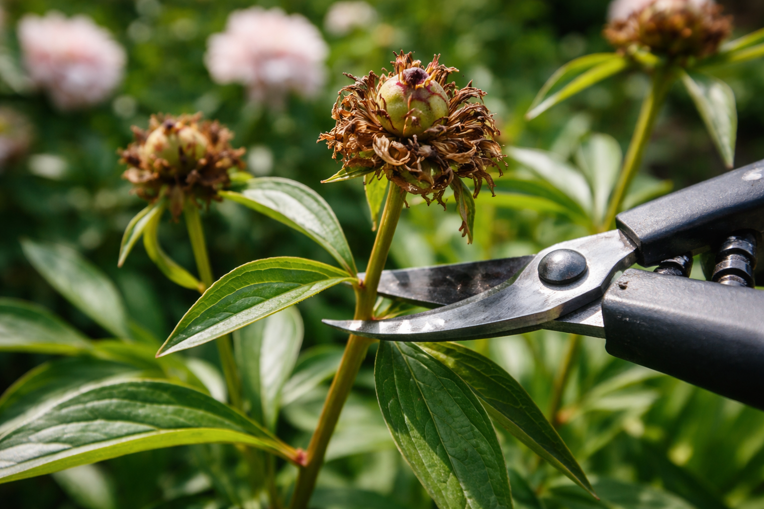 Cuando se caen los pétalos, la planta empieza a formar cápsulas de semillas. Este es el proceso que más energía consume en la vida de una peonía. Si no las cortas, el arbusto gastará todos sus nutrientes en semillas, que probablemente no necesites. Como resultado, al año siguiente obtendrás pequeños brotes o un verdor vacío.