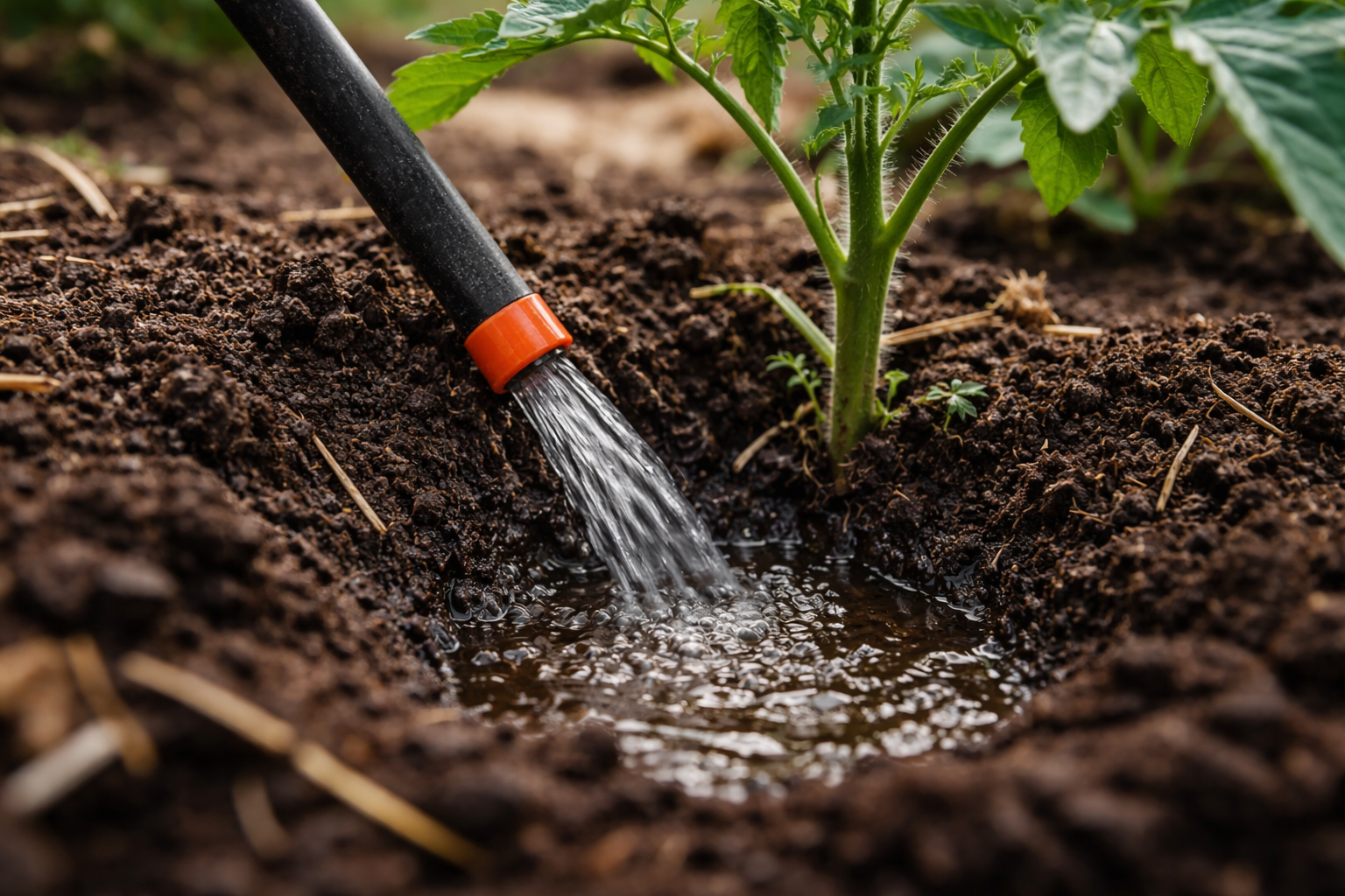 Dirija un chorro suave de agua hacia un pequeño orificio artificial alrededor del tallo para garantizar que la humedad penetre en profundidad y no se extienda por la superficie del lecho.