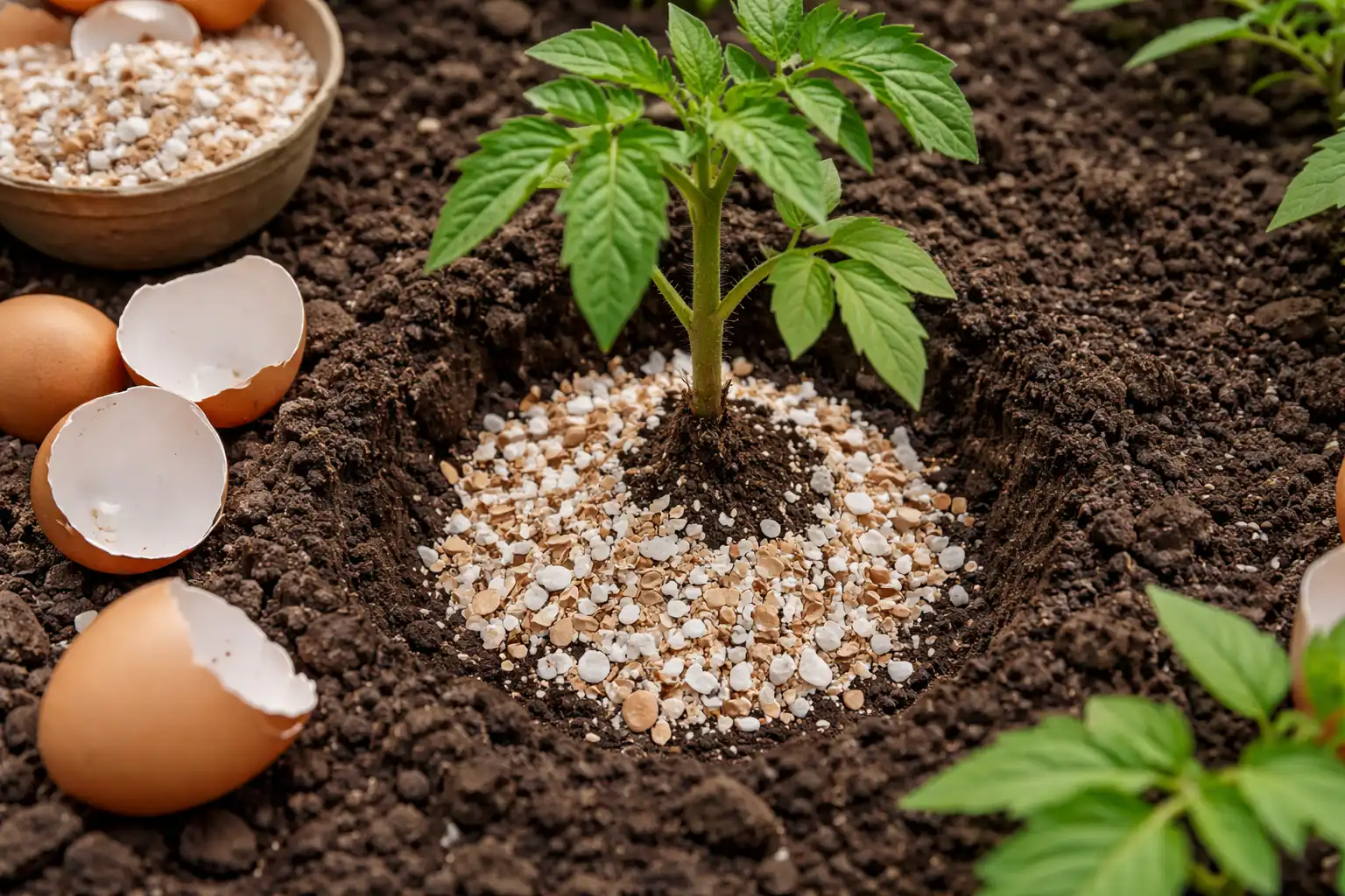 Nunca apliques trozos enteros directamente bajo la raíz del tomate, ya que la planta tardará años en extraer micronutrientes útiles para la formación de ovarios.