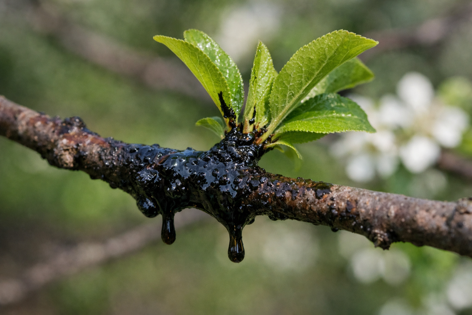 Esta emulsión de jabón y alquitrán protege perfectamente los brotes jóvenes de cerezos, guindos, albaricoqueros y manzanos.