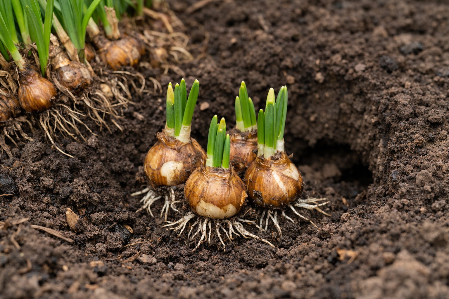 Para una floración abundante, es sumamente importante observar la regla de la profundidad: plantar estrictamente tres veces la altura del bulbo mismo. En el fondo del pozo es útil añadir un poco de arena de río para el drenaje. La plantación otoñal en suelo renovado dará un fuerte arranque al sistema radicular.