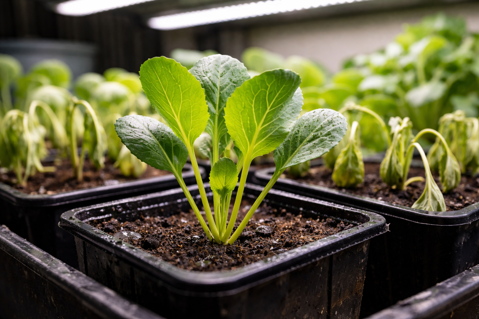 El segundo error crítico es la violación del régimen de temperaturas. La col, por naturaleza, prefiere el frescor. Si se combina la falta de luz con el calor de los radiadores, se obtiene un rápido crecimiento de la col. alargamiento del talloque agota la plántula y provoca su marchitamiento.